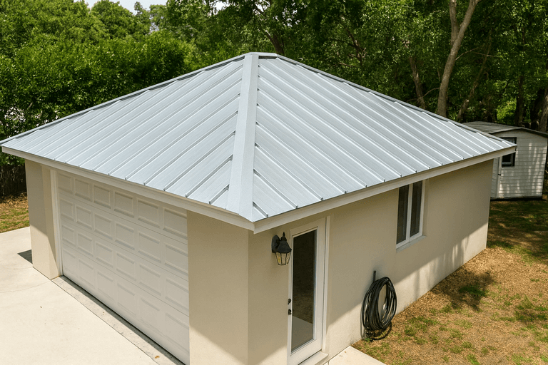 Устанавливаем профлист, металлочерепицу или другое покрытие по регламенту производителя — на этом этапе видно, сколько стоит покрыть крышу гаража в вашей конфигурации. - Финишные операции